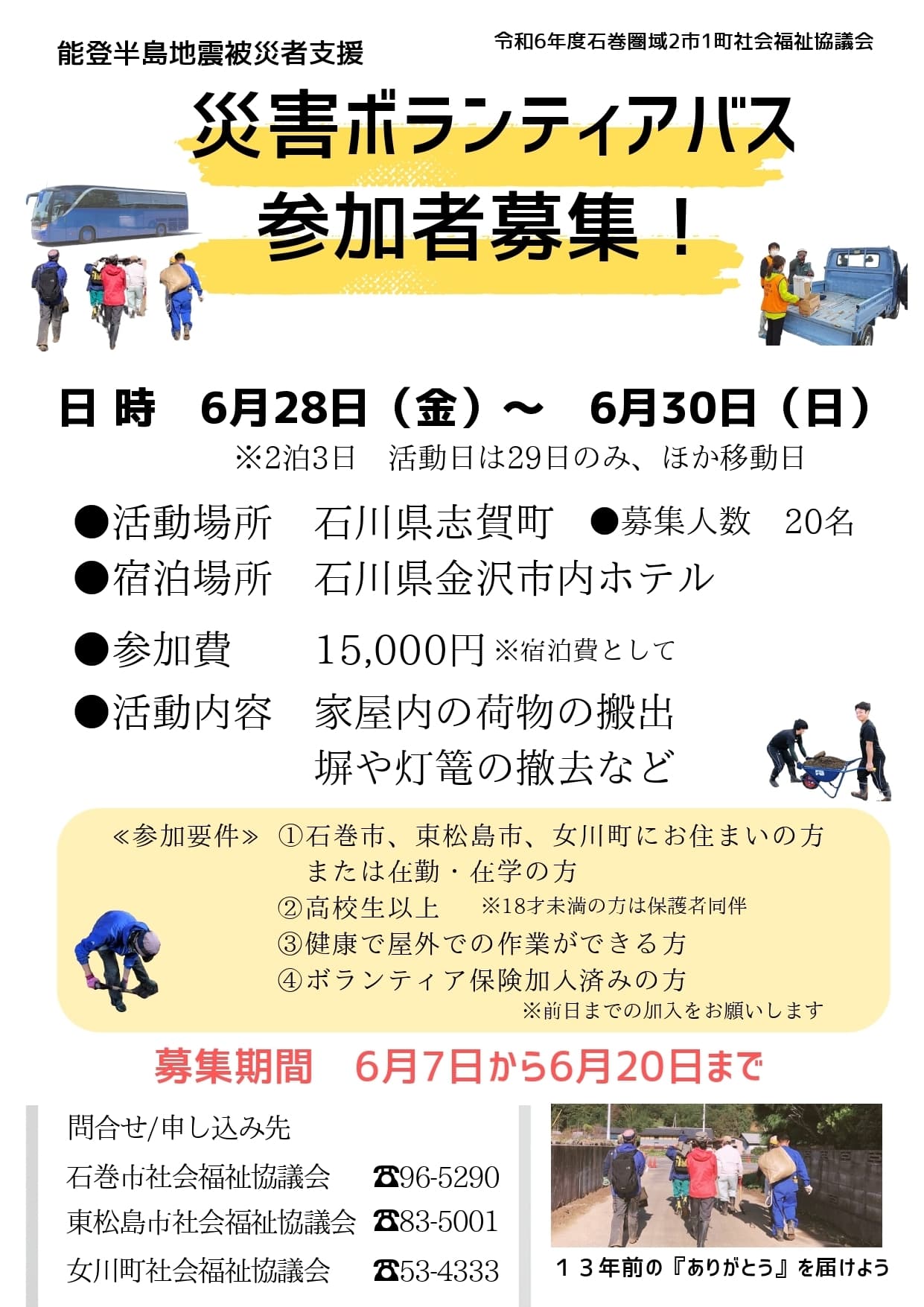 能登半島地震への支援活動を希望する石巻圏域の住民に、災害ボランティア活動に参加する機会をつくることを目的に、被災者支援ボランティアバスの派遣を行います。