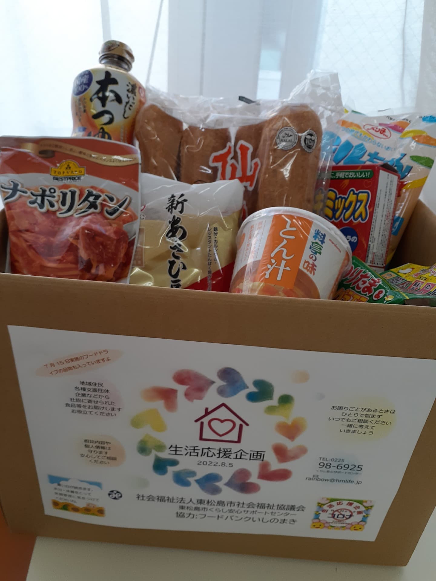 社会福祉法人東松島市社会福祉協議会では市民の方から寄せられた食品(フードドライブ)と合わせ、経済的に困っている世帯の方へ食料の提供を致します。