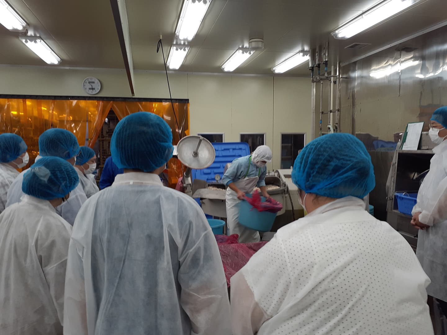 原料の仕入れから魚の1次加工、すり身にする作業、ちくわやはんぺんを焼き上げる工程など仕入れから箱詰めするまでの一連の流れをご説明いただきました。