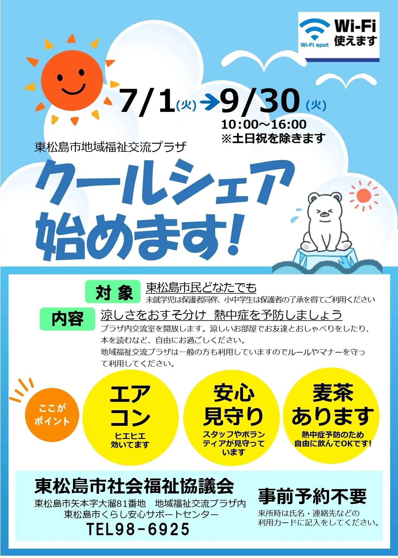 東松島市くらし安心サポートセンターでは、気候変動に伴う暑熱環境の悪化等により、熱中症のリスクが高まっている状況を踏まえ、「涼を共有する場」として、また、保護者の共働きなどにより長時間一人で過ごす夏休み中の子供たちの「孤立の解消」の場として、東松島市地域福祉交流プラザの交流室を開放し、クールシェアを開催しております!